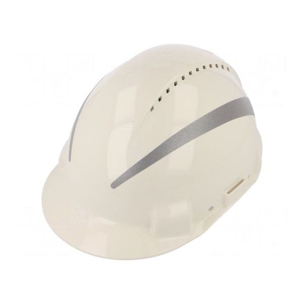 Hełm ochronny wykonany z materiału ABS zapewnia ochronę głowy w środowisku pracy. Model ten posiada konstrukcję wentylowaną, co poprawia cyrkulację powietrza użytkownika. Wyposażony jest w element odblaskowy, który zwiększa widoczność pracownika.