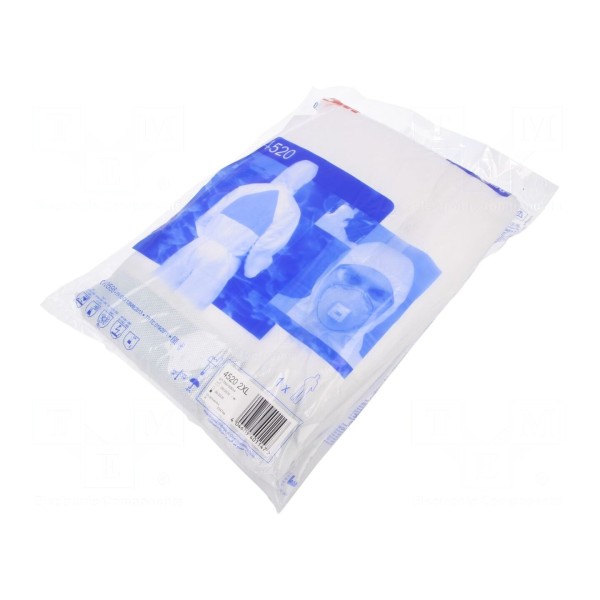 Kombinezon ochronny 3M 4520 w rozmiarze XXL stanowi element odzieży ochronnej kategorii III, typ 5/6. Konstrukcja produktu została zaprojektowana w kolorze białym z zielonym tylnym panelem, co poprawia wentylację podczas użytkowania.