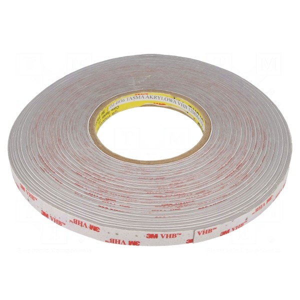 Taśma mocująca 3M 4936 to dwustronnie klejący produkt oparty na nośniku z pianki akrylowej o grubości 0,6mm. Szerokość taśmy wynosi 12mm, a całkowita długość rolki to 33m. Zastosowany klej akrylowy zapewnia połączenie o wysokiej wytrzymałości mechanicznej oraz wysokiej rezystancji elektrycznej.