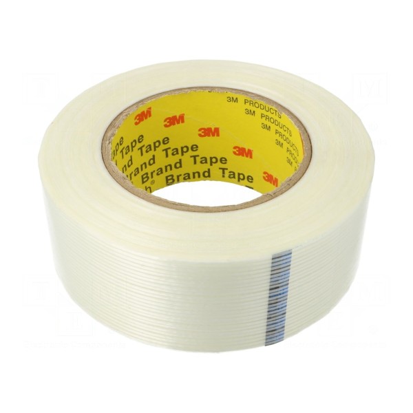 Taśma mocująca 3M o szerokości 48 mm i długości 55 m wykonana jest z polipropylenu wzmocnionego włóknem szklanym. Jako klej zastosowano kauczuk syntetyczny, co zapewnia wysoką przyczepność do powierzchni. Całkowita grubość taśmy wynosi 0,15 mm, a jej kolor jest biały z przezroczystym wykończeniem.