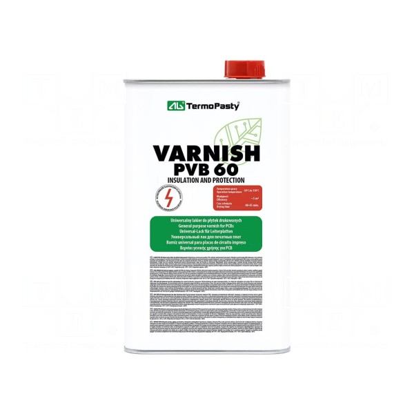 Lakier PVB to preparat chemiczny w postaci płynu o przezroczystej barwie, dostarczany w butelce o pojemności 1 litra. Produkt przeznaczony jest do zabezpieczania płytek drukowanych oraz sprzętu elektronicznego przed wpływem czynników zewnętrznych. Jego zakres temperatury pracy wynosi od -50°C do 150°C, przy temperaturze zapłonu wynoszącej 380°C.
