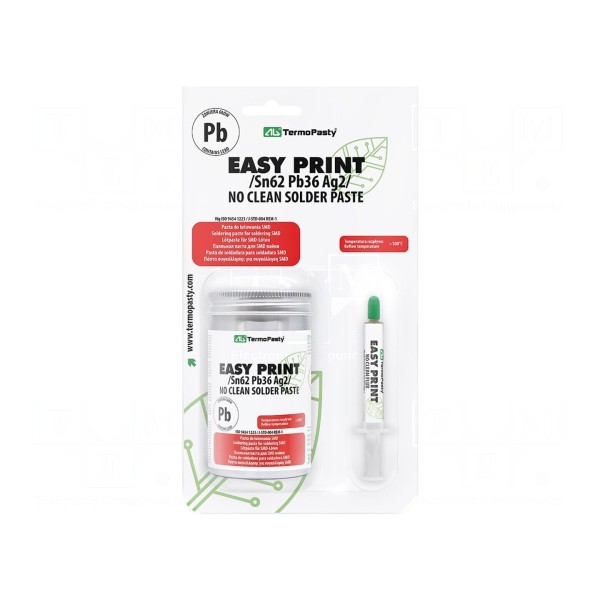 Pasta lutownicza ołowiowa Sn62Pb36Ag2 przeznaczona jest do lutowania miękkiego w przemyśle elektronicznym. Produkt charakteryzuje się temperaturą topnienia wynoszącą 179°C oraz rozmiarem ziaren w zakresie 25–45 µm. W składzie znajduje się 12% topnika typu bezhalogenkowego, sklasyfikowanego jako No Clean i REL0.