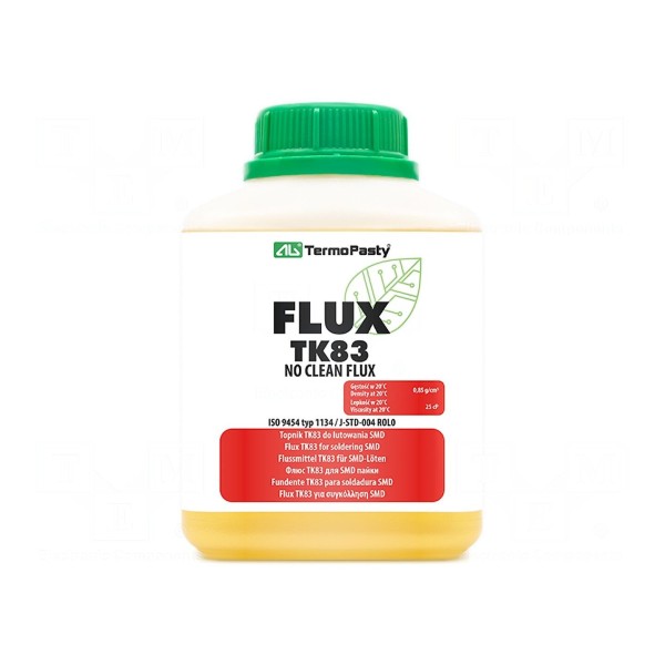 Topnik kalafoniowy TK83 jest preparatem w formie płynu, przeznaczonym do procesów lutowniczych. Produkt charakteryzuje się gęstością 860mg/cm³ w temperaturze 20°C oraz zawartością ciał stałych na poziomie 24%. Jest to topnik typu No Clean, zgodny z normą PN EN 29454.