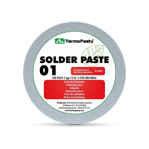 Pasta lutownicza AG TERMOPASTY ART.AGT-037 to topnik kalafoniowy typu halogenkowego RMA, przeznaczony do procesów lutowniczych. Produkt charakteryzuje się zakresem temperatury pracy od 50°C do 200°C, co pozwala na stosowanie go w różnych technikach łączenia komponentów elektronicznych.