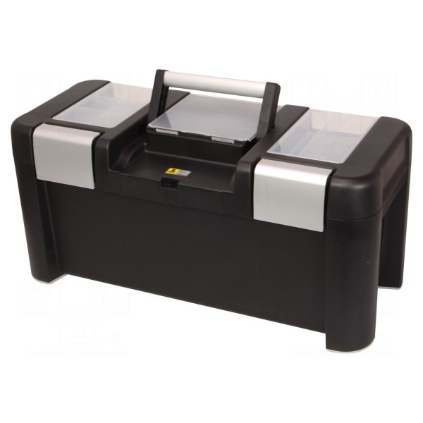Wymiary zewnętrzne pojemnika wynoszą 640x290x295 mm, natomiast przestrzeń wewnętrzna to 550x205x150 mm. Wewnątrz skrzynki znajduje się przenośna tacka podnośna, ułatwiająca organizację narzędzi ręcznych.