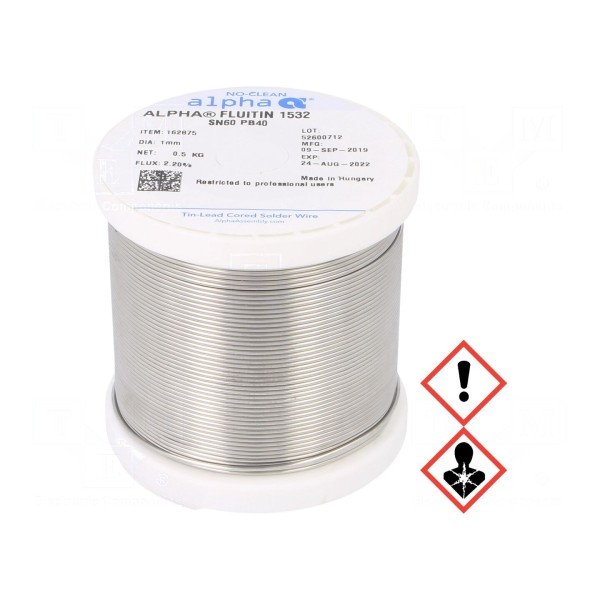 Spoiwo lutownicze ołowiowe w formie drutu przeznaczone do lutowania miękkiego. Skład stopu Sn60Pb40 charakteryzuje się zakresem temperatury topnienia wynoszącym 183–190°C. Produkt o średnicy 1 mm został nawinięty na szpulę o masie całkowitej 0,5 kg.