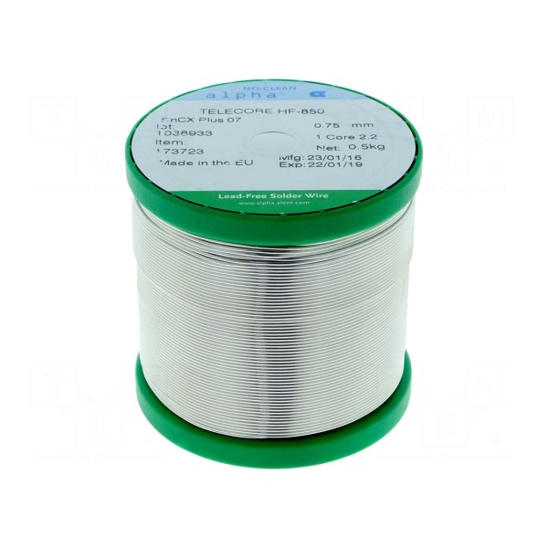 Bezołowiowy drut lutowniczy wykonany ze stopu Sn99,3Cu0,7, przeznaczony do procesów lutowania miękkiego. Materiał charakteryzuje się średnicą 0,75 mm i oferowany jest w postaci szpuli o masie całkowitej 0,5 kg.
