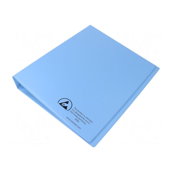 Segregator ESD w formacie A4 wykonany został z tworzywa PVC w jasnoniebieskim kolorze. Konstrukcja produktu została zaprojektowana w sposób zapobiegający osadzaniu się ładunków elektrycznych, co umożliwia jego eksploatację w strefach chronionych przed wyładowaniami elektrostatycznymi zgodnie z wymogami normy EN 61340-5-1.