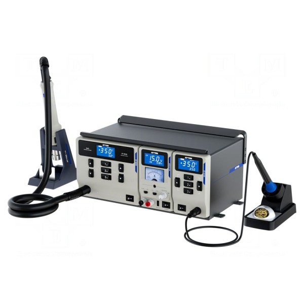 W zestawie: dysza AT-A2605, dysza AT-A2664, dysza AT-B2608, dysza AT-B2610, grot T900-0.2SI, kolba gorącego powietrza ST-SP-102B, lutownica, podstawka pod lutownicę, zasilacz laboratoryjny. Konstrukcja umożliwia szybką wymianę dysz oraz posiada włącznik temperatury zintegrowany w kolbie gorącego powietrza.