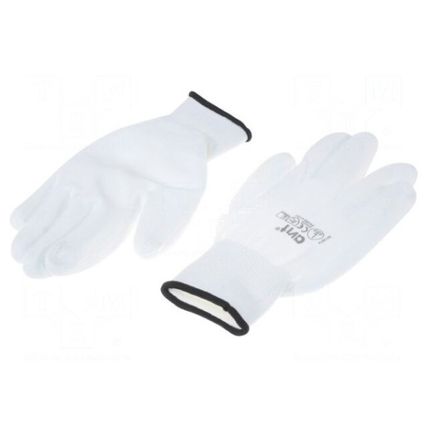 Rękawice ochronne w rozmiarze L wykonane są z bezszwowej dzianiny nylonowej po stronie grzbietowej, co zapewnia przepuszczalność powietrza podczas długotrwałego użytkowania. Wyposażono je w moletowaną powłokę poliuretanową, która zwiększa pewność chwytu przy manipulowaniu przedmiotami. Produkt charakteryzuje się dobrą odpornością na przedarcia oraz ścieranie, zgodnie z wymaganiami norm EN 388 oraz EN 420 Class 2.