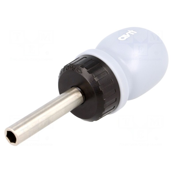 Rękojeść wkrętakowa z grzechotką, uchwyt 1/4"Rękojeść wkrętakowa przeznaczona jest do współpracy z końcówkami sześciokątnymi o rozmiarze 1/4". Narzędzie wyposażone jest w mechanizm grzechotkowy, który usprawnia pracę w warunkach wymagających wielokrotnego dokręcania lub odkręcania. Całkowita długość narzędzia wynosi 110 mm, przy długości części roboczej równej 45 mm. Uchwyt dostosowany jest do standardu C6,3 mm (1/4").