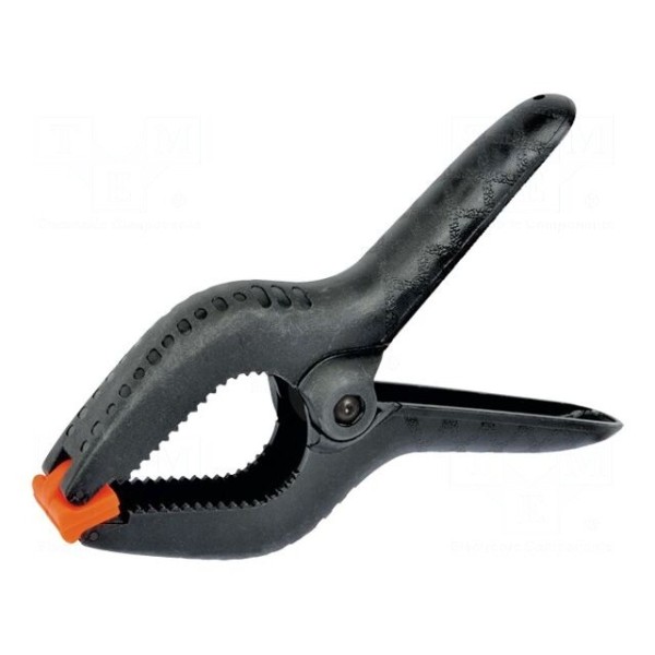 Ścisk uniwersalny o długości całkowitej 150 mm wykonany został z tworzywa sztucznego. Urządzenie pozwala na chwytanie przedmiotów w zakresie od 0 do 53 mm.