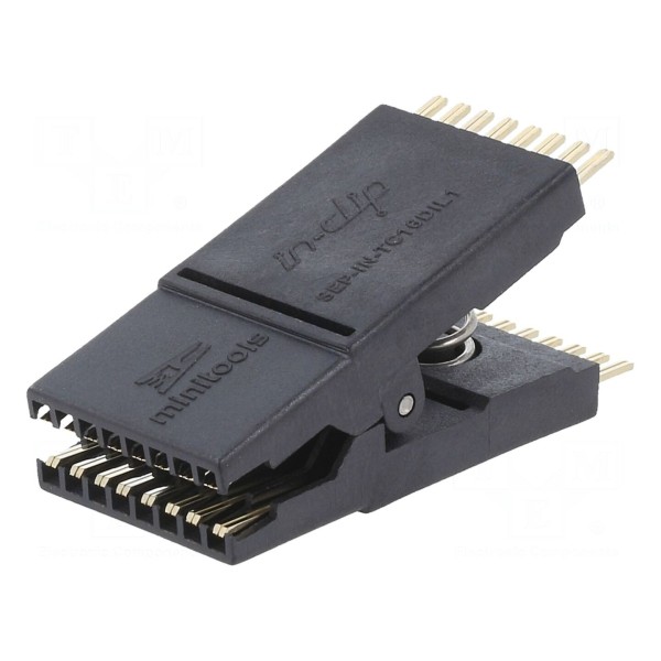 Klips pomiarowy przeznaczony jest do współpracy z układami w obudowach DIL16. Element posiada pozłacane styki, co wpływa na parametry połączenia elektrycznego, oraz cechuje się konstrukcją w kolorze czarnym.
