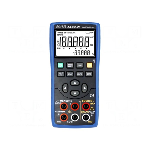 Axiomet AX-C615N to kalibrator pętli umożliwiający pomiar oraz symulację sygnałów elektrycznych w procesach przemysłowych. Urządzenie obsługuje pomiar napięcia stałego DC w zakresie od 0 do 30V z rozdzielczością 1mV oraz prądu stałego w zakresie od 0 do 30mA z rozdzielczością 1µA. Dokładność pomiarowa dla napięcia wynosi ±(0,02% + 2mV), natomiast dla prądu osiąga poziom ±(0,02% + 4µA).