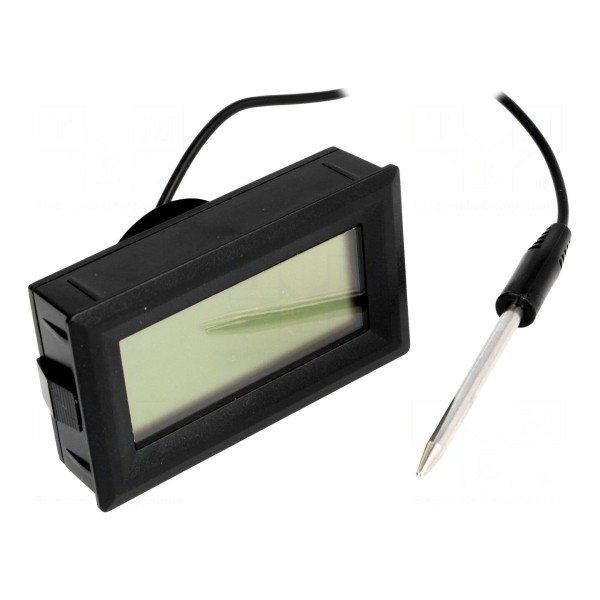 Zestaw zawiera sondę pomiarową o długości 60mm na przewodzie o długości 1m. Zasilanie zapewnia pojedyncza bateria LR44 1,5V, a stan jej wyczerpania sygnalizowany jest przez dedykowany wskaźnik. Całe urządzenie ma wymiary 67x35x20mm i masę 45g, co pozwala na zastosowanie w ograniczonych przestrzeniach montażowych.