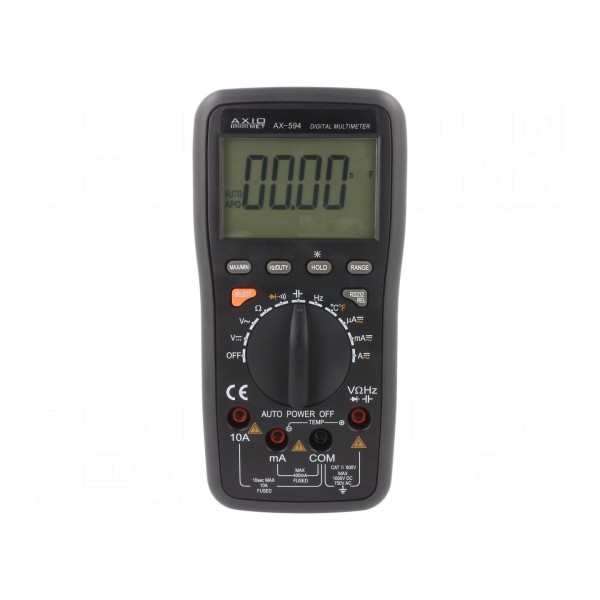 AXIOMET AX-594 to multimetr cyfrowy wyposażony w wyświetlacz LCD o rozdzielczości 3,75 cyfry (3999). Urządzenie umożliwia pomiar napięcia DC do 1kV, napięcia AC do 750V, prądu AC/DC do 10A, a także rezystancji do 40MΩ, pojemności do 200µF, częstotliwości do 30MHz oraz temperatury w zakresie od -20 do 1000°C. Przyrząd oferuje próbkowanie na poziomie 3x/s oraz dodatkowy bargraf 41-segmentowy z prędkością 30x/s.