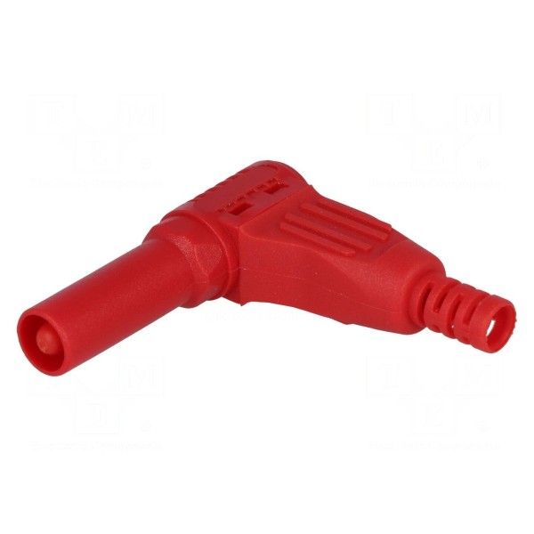 Złącze bananowe 4mm, wtyk kątowy, 32A, kolor czerwony