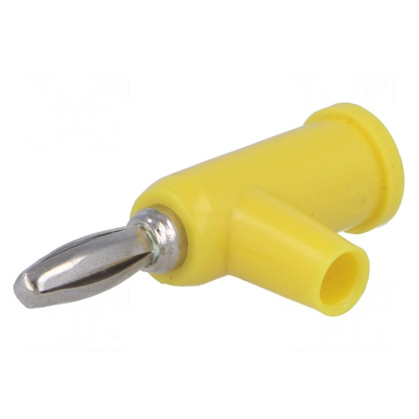 Element posiada długość całkowitą wynoszącą 39mm i jest przeznaczony do montażu w gniazdach o średnicy 4mm. Złącze występuje w kolorze żółtym, co ułatwia identyfikację poszczególnych przewodów lub torów w systemach laboratoryjnych.