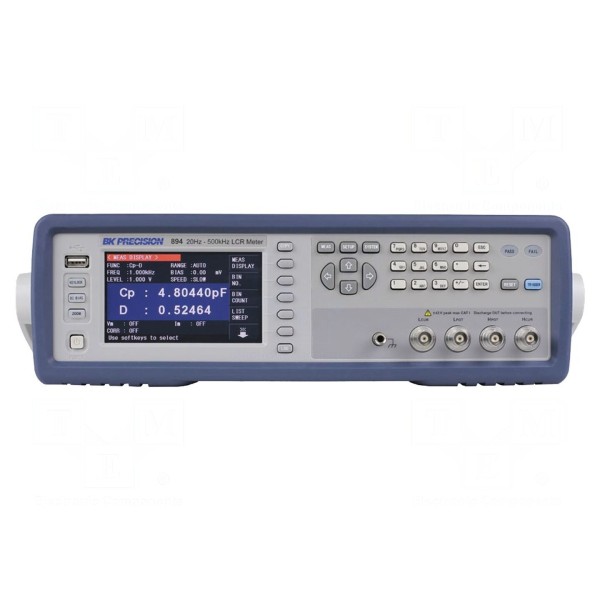 Mostek RLC BK894 służy do precyzyjnych pomiarów parametrów elementów elektronicznych, w tym indukcyjności, pojemności, rezystancji, admitancji, konduktancji oraz susceptancji. Urządzenie pozwala również na wyznaczanie dobroci Q, współczynnika stratności D, kąta fazowego θ oraz rezystancji stałoprądowej DCR. Zakresy pomiarowe obejmują od 10mΩ do 100MΩ dla rezystancji, od 10nH do 100kH dla indukcyjności oraz od 0,01pF do 100mF dla pojemności, przy częstotliwości pomiarowej regulowanej w zakresie od 20Hz do 500kHz.