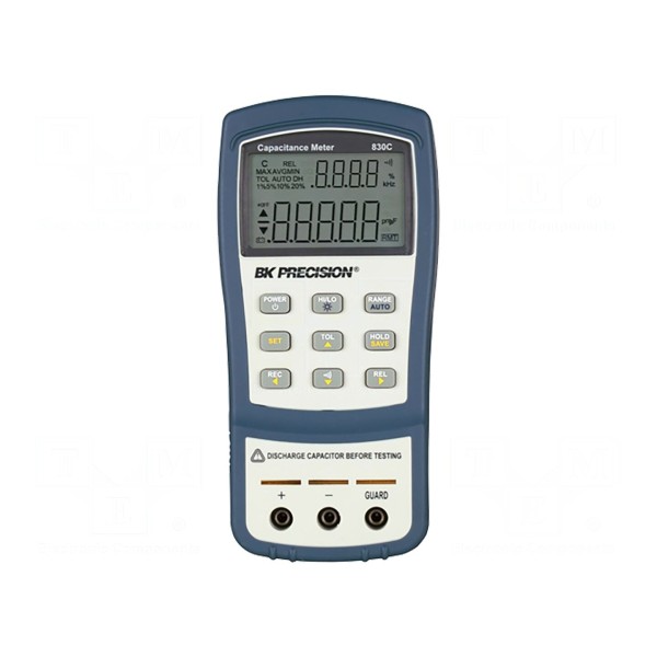 Miernik pojemności BK830C przeznaczony jest do precyzyjnego wyznaczania wartości kondensatorów w zakresie od 1nF do 199,99mF. Urządzenie wyposażone jest w wyświetlacz LCD o rozdzielczości 4,5 cyfry (11000 zliczeń) z funkcją podświetlenia, co umożliwia odczyt wyników w różnych warunkach oświetleniowych. Pomiar odbywa się z częstotliwością próbkowania 5 razy na sekundę, przy zapewnionej dokładności podstawowej na poziomie ±(0,5% + 3 cyfry).