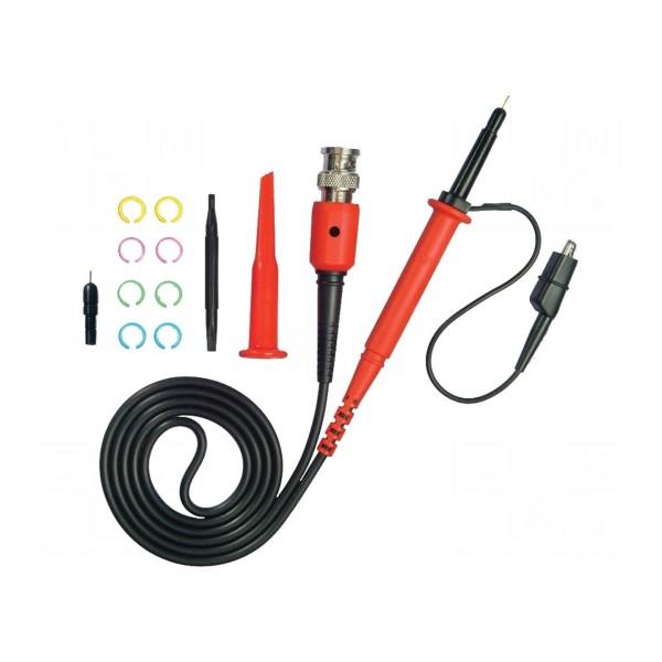 Parametry wejściowe urządzenia wynoszą 100MΩ oraz 5pF, co zapewnia odpowiednie dopasowanie w torze pomiarowym. Sonda została wyposażona w przewód o długości 1,2m, zakończony standardowym wtykiem BNC, co umożliwia bezpośrednie podłączenie do większości modeli oscyloskopów dostępnych na rynku.