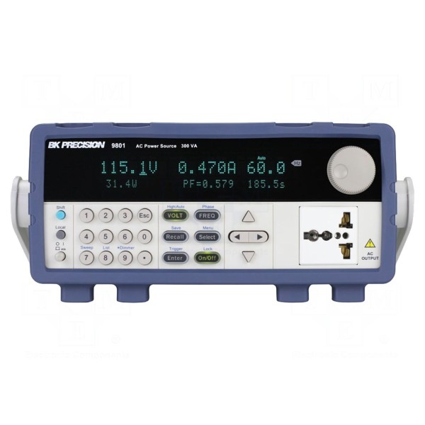 Programowalny zasilacz laboratoryjny B&K PRECISION BK9801 to jednokanałowe urządzenie prądu zmiennego, umożliwiające pracę przy napięciu wyjściowym do 300V AC i maksymalnym natężeniu prądu 3A. Urządzenie oferuje rozdzielczość napięcia wyjściowego 0,1V oraz rozdzielczość prądu wyjściowego 0,1mA. Szeroki zakres częstotliwości pracy wynosi od 45 do 500Hz, a zasilanie przyrządu mieści się w granicach 100...240V AC.