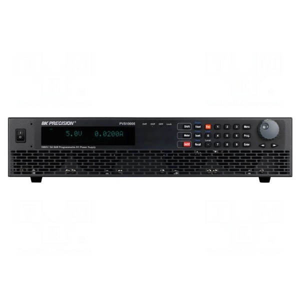 Programowalny zasilacz laboratoryjny B&K PRECISION PVS10005 to jednokanałowe, regulowane urządzenie o mocy maksymalnej 5kW. Zasilacz oferuje napięcie wyjściowe do 1kV DC przy natężeniu prądu do 5A. Rozdzielczość nastaw wynosi 0,1V dla napięcia oraz 0,1mA dla prądu wyjściowego. Urządzenie charakteryzuje się tętnieniami i szumami na poziomie ≤100mVrms oraz ≤600mVpp.