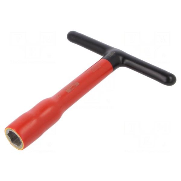 Klucz nasadowy izolowany typu T przeznaczony jest do prac pod napięciem do 1kV. Narzędzie zostało wykonane ze stali stopowej, co przekłada się na jego trwałość podczas codziennej pracy elektryka.
