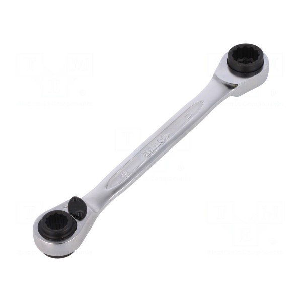 Klucz oczkowy dwustronny wyposażony w mechanizm grzechotkowy umożliwia obsługę czterech różnych rozmiarów śrub: 8mm, 9mm, 10mm oraz 11mm. Zastosowana konstrukcja pozwala na obsługę wielu średnic za pomocą jednego narzędzia, co ułatwia pracę w ograniczonych przestrzeniach.