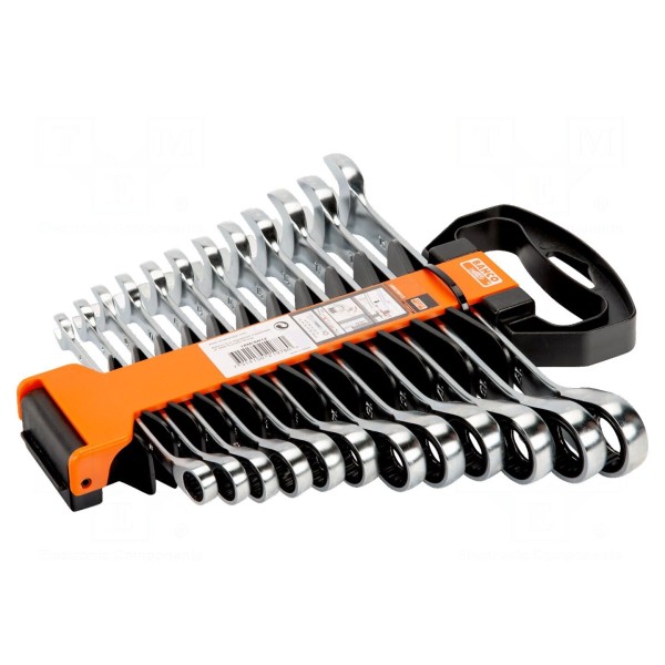 Zestaw kluczy płasko-oczkowych z mechanizmem grzechotkowym obejmuje 12 elementów o zróżnicowanych rozmiarach. W komplecie znajdują się klucze o wymiarach 8mm, 9mm, 10mm, 11mm, 13mm, 14mm, 15mm, 16mm, 17mm, 18mm oraz 19mm.
