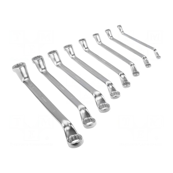 Zestaw zawiera 8 sztuk kluczy oczkowych. Narzędzia wykonane są ze stali stopowej, co zapewnia wymaganą wytrzymałość podczas prac warsztatowych.