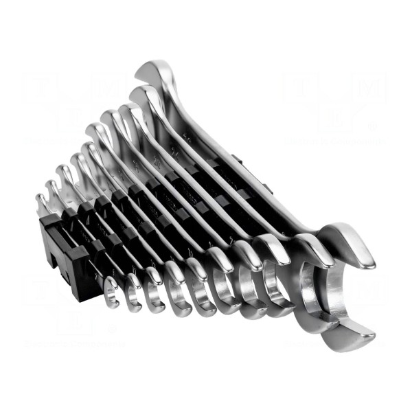 Zestaw zawiera klucze płaskie przeznaczone do prac montażowych i warsztatowych. Komplet składa się z 10 elementów, które umożliwiają obsługę szerokiego zakresu rozmiarów śrub i nakrętek.
