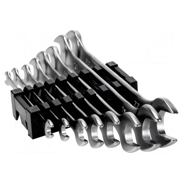 Zestaw zawiera klucze płaskie o rozmiarach od 6 mm do 22 mm. W skład kompletu wchodzi osiem elementów dobranych pod kątem prac montażowych i serwisowych.