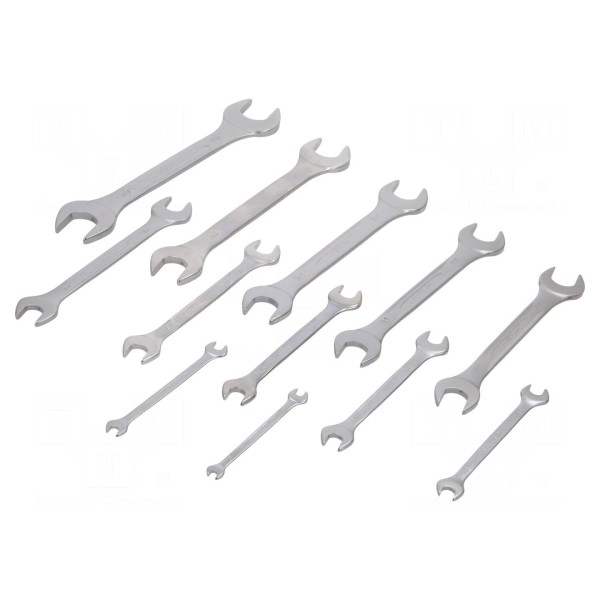 Zestaw kluczy płaskich składa się z 12 elementów przeznaczonych do prac montażowych i serwisowych. Narzędzia te umożliwiają obsługę śrub i nakrętek o zróżnicowanych rozmiarach, dostosowanych do wymagań technicznych w warsztacie.