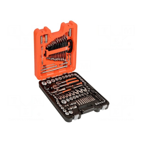 W skład zestawu wchodzą: grzechotka 1/2", grzechotka 1/4", grzechotka 3/8", nasadki 6-kątne 1/2", nasadki 6-kątne 1/4", przedłużacz 1/2" o długości 125mm, przedłużacz 1/2" o długości 250mm, przedłużacz 1/4" o długości 50mm, przedłużacz 1/4" o długości 100mm, przedłużacz 3/8" o długości 75mm oraz przedłużacz 3/8" o długości 150mm. Całość przechowywana jest w walizce, która ułatwia transport i przechowywanie narzędzi.