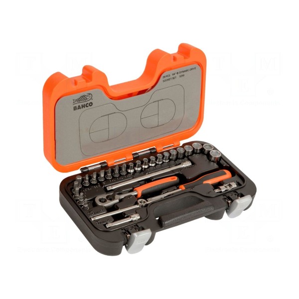 Zestaw kluczy nasadowych 1/4" marki BAHCO składa się z 29 elementów wykonanych ze stali chromowo-wanadowej. W skład kompletu wchodzą nasadki 6-kątne w rozmiarach od 4 mm do 13 mm, co zapewnia szeroki zakres obsługi połączeń śrubowych.