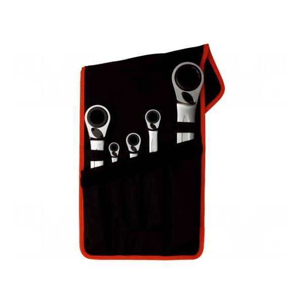 Zestaw zawiera klucze typu oczkowego wyposażone w mechanizm grzechotkowy. W komplecie znajduje się pięć sztuk narzędzi o różnych rozmiarach, obejmujących zakres od 8 mm do 36 mm.