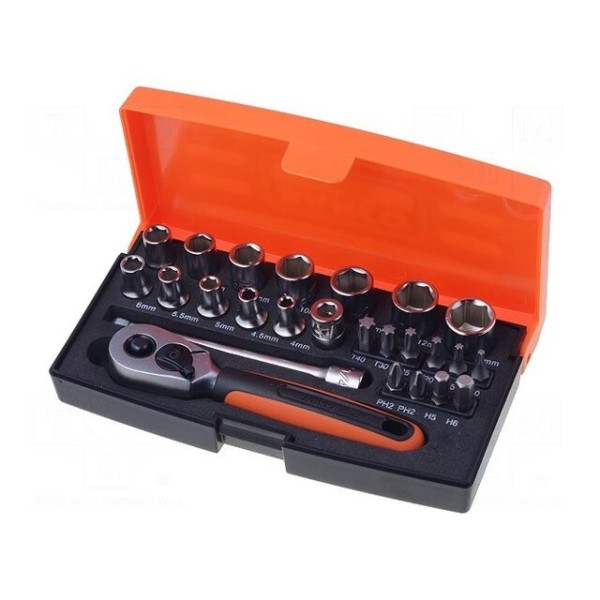 Ten zestaw narzędzi zawiera 25 elementów wykonanych ze stali stopowej, przeznaczonych do prac montażowych i serwisowych. Komplet obejmuje uchwyt grzechotkowy 1/4" o długości 120 mm, przedłużacz 100 mm oraz różnorodne końcówki nasadowe i wkrętakowe. Zróżnicowane rozmiary gniazd HEX od 4 mm do 12 mm oraz groty w typach imbus, Phillips i Torx pozwalają na obsługę szerokiej gamy śrub i nakrętek.