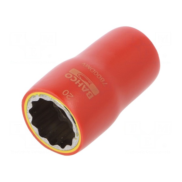 Nasadka izolowana typu 12-kątnego została wykonana ze stali stopowej, co zapewnia wymaganą wytrzymałość w trakcie prac montażowych. Element posiada rozmiar gniazda 20 mm oraz mocowanie typu 1/2 cala. Całkowita długość narzędzia wynosi 50 mm.