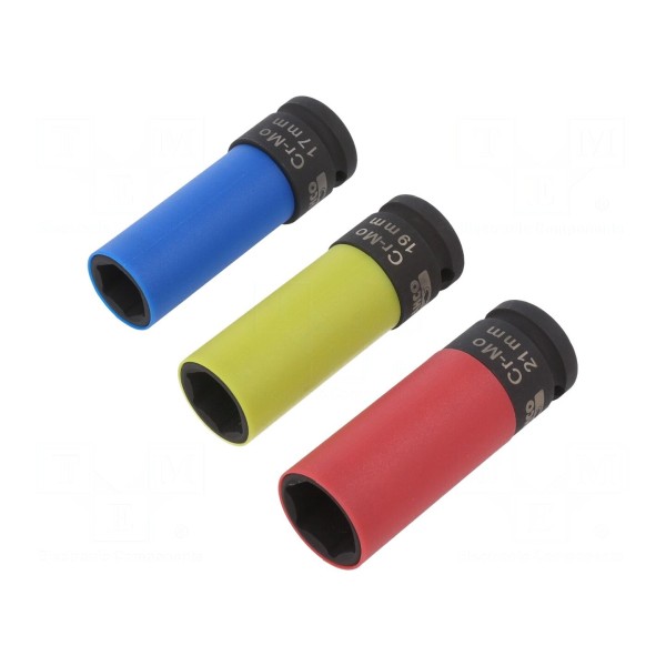 Zestaw zawiera trzy nasadki udarowe przeznaczone do pracy z kołami pojazdów. Elementy posiadają gniazdo montażowe o rozmiarze 1/2" i charakteryzują się konstrukcją 6-kątną.