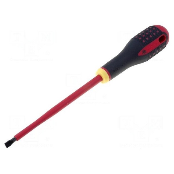 Izolowany wkrętak płaski przeznaczony do prac elektrycznych pod napięciem do 1kV AC. Grot o wymiarach 6,5x1,2mm wykonany jest ze stali typu vanadium-extra, co zapewnia trwałość narzędzia. Powierzchnia ostrza została poddana procesowi chromowania, a końcówka robocza jest czerniona.