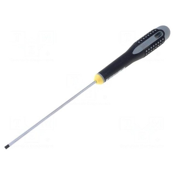 Wkrętak standardowy wyposażony w płaski grot o rozmiarze 3x0,5mm. Ostrze o długości 125mm wykonane zostało ze stali typu vanadium-extra, co przekłada się na jego trwałość użytkową. Całkowita długość narzędzia wynosi 247mm.