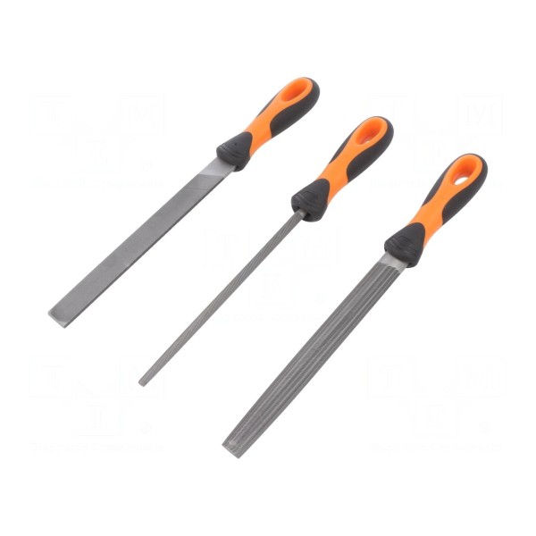 Zestaw zawiera trzy pilniki typu półgładzik przeznaczone do obróbki metalu. Narzędzia charakteryzują się długością części roboczej wynoszącą 200 mm oraz nacięciem o stopniu 2. W skład kompletu wchodzą pilniki o przekrojach: okrągłym, płaskim oraz półokrągłym, co umożliwia dopasowanie narzędzia do kształtu obrabianej powierzchni.