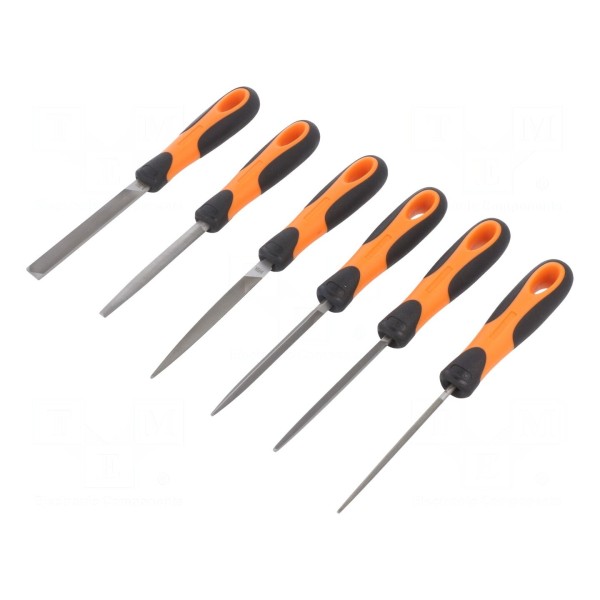 Narzędzia wyposażone są w plastikowe rękojeści, które zapewniają pewny chwyt podczas użytkowania. Całość kompletu dostarczana jest w futerale, który ułatwia organizację oraz przechowywanie pilników w warunkach warsztatowych.