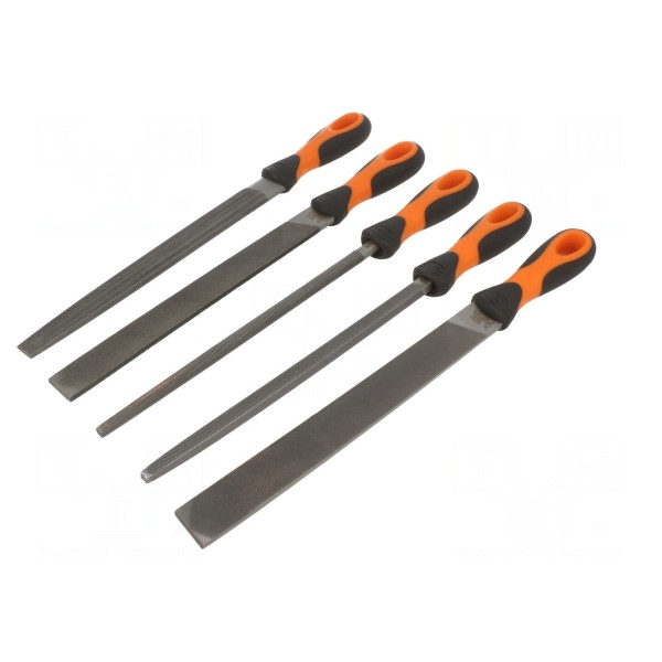 Zestaw zawiera pięć pilników o długości części roboczej 250mm, dostarczanych w etui. Komplet obejmuje narzędzia o różnych kształtach przekroju: kwadratowym, okrągłym, płaskim oraz półokrągłym, przy czym pilnik o przekroju płaskim występuje w dwóch egzemplarzach.