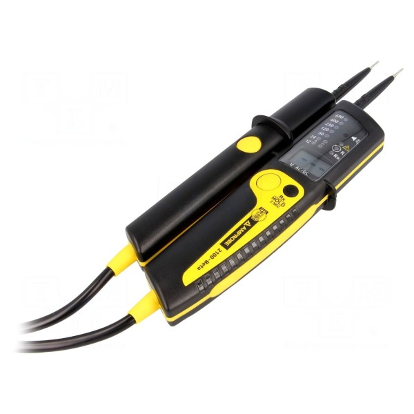 Tester elektryczny BEHA-AMPROBE 2100-BETA przeznaczony jest do pomiaru napięcia stałego oraz przemiennego w zakresie od 12V do 690V. Urządzenie obsługuje pasmo dla pomiarów napięcia AC wynoszące 16,66–400Hz. Dokładność pomiaru dla obu typów napięcia wynosi ±(3% + 3 cyfry). Oprócz standardowych odczytów, tester umożliwia kontrolę ciągłości obwodu do 500kΩ oraz identyfikację kierunku wirowania faz w zakresie 170–690V AC.