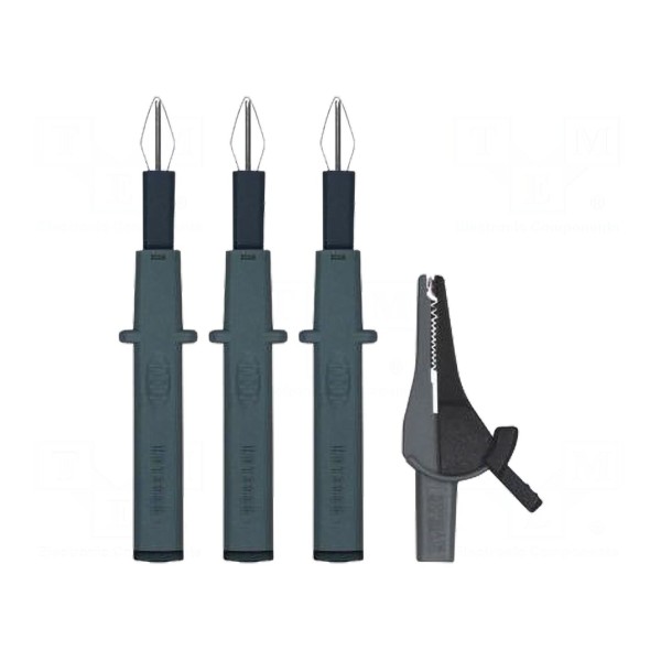 Zestaw końcówek pomiarowych marki BEHA-AMPROBE został wykonany z materiału izolacyjnego PVC, co zapewnia odpowiednią ochronę podczas pracy. Elementy wyposażono w gniazda bananowe typu 4mm, a całość jest zgodna z normą EN 61010 oraz kategorią bezpieczeństwa CAT II 1000V.