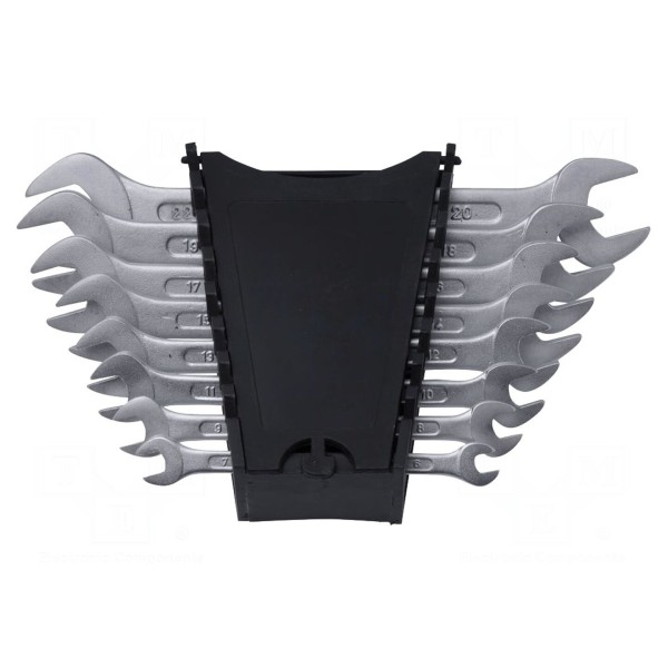 W komplecie znajdują się klucze o następujących rozmiarach: 6mm, 7mm, 8mm, 9mm, 10mm, 11mm, 12mm, 13mm, 14mm, 15mm, 16mm, 17mm, 18mm, 19mm, 20mm oraz 22mm. Konstrukcja typu płaskiego umożliwia pracę w miejscach o ograniczonej przestrzeni roboczej.