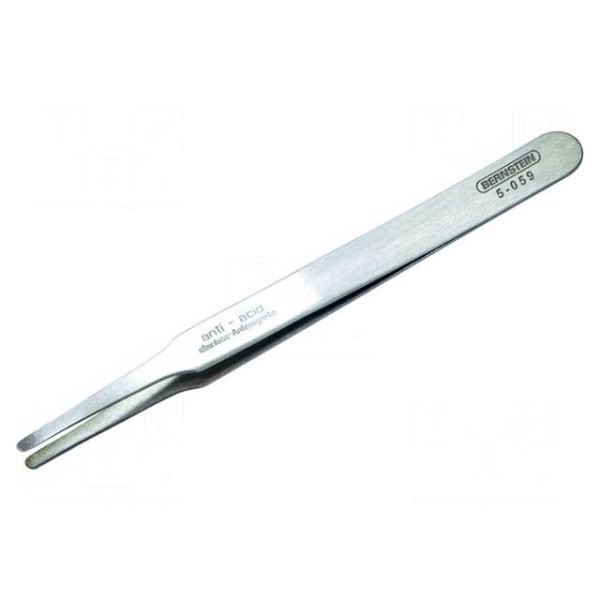 Pęseta prosta o długości 120 mm wykonana została ze stali nierdzewnej. Narzędzie charakteryzuje się zaokrągloną końcówką o szerokości 2 mm, co umożliwia operowanie niewielkimi elementami w pracach precyzyjnych.
