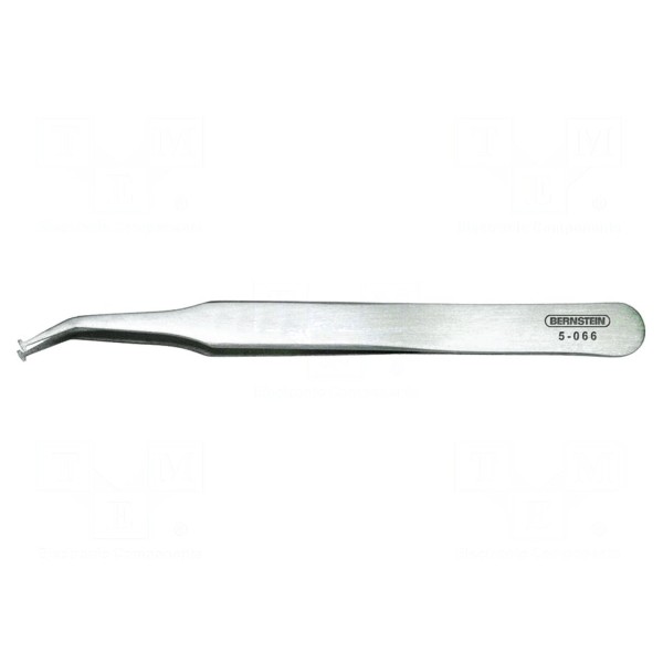 Pęseta zagięta o długości 120 mm wykonana jest ze stali nierdzewnej. Narzędzie posiada końcówkę o kształcie trapezowym, co umożliwia chwytanie różnego rodzaju elementów.